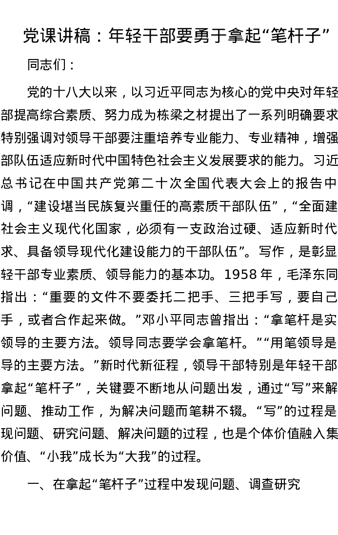 党课讲稿:年轻干部要勇于拿起“笔杆子”