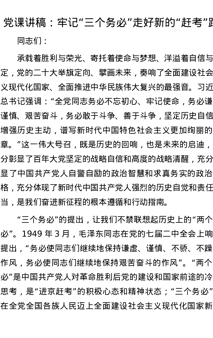 党课讲稿:牢记“三个务必” 走好新的“赶考”路