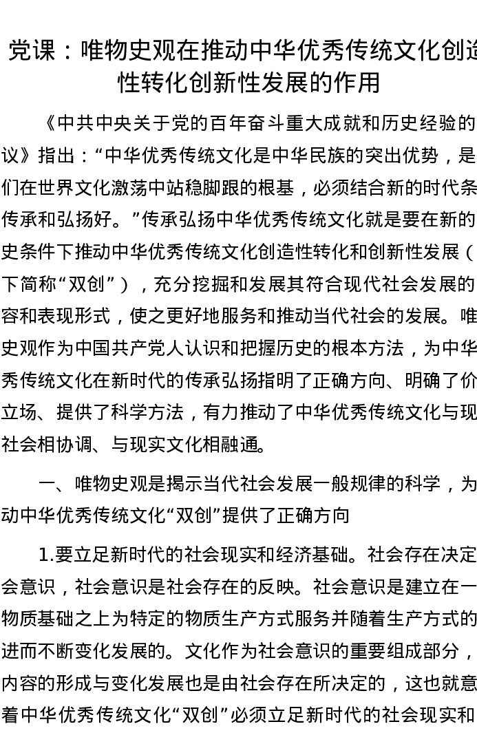 党课:唯物史观在推动中华优秀传统文化创造性转化创新性发展的作用