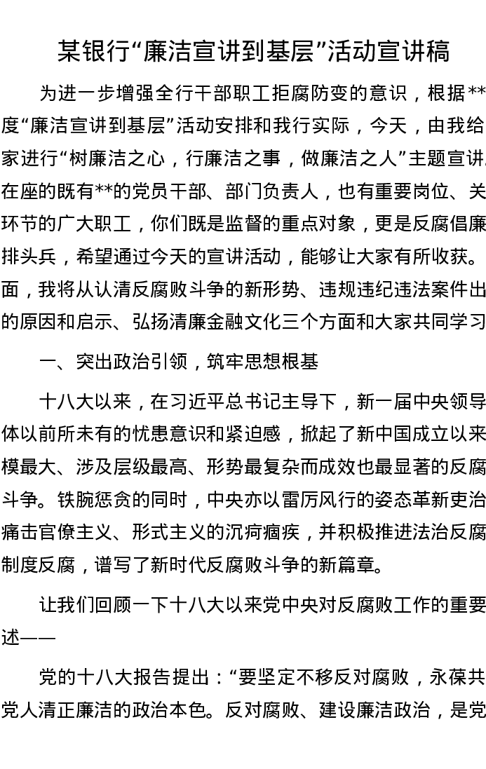 某银行“廉洁宣讲到基层”活动宣讲稿