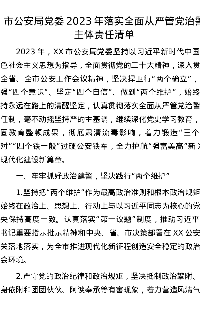 市公安局党委2023年落实全面从严管党治警主体责任清单