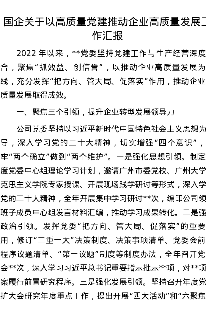 国企关于以高质量党建推动企业高质量发展工作汇报