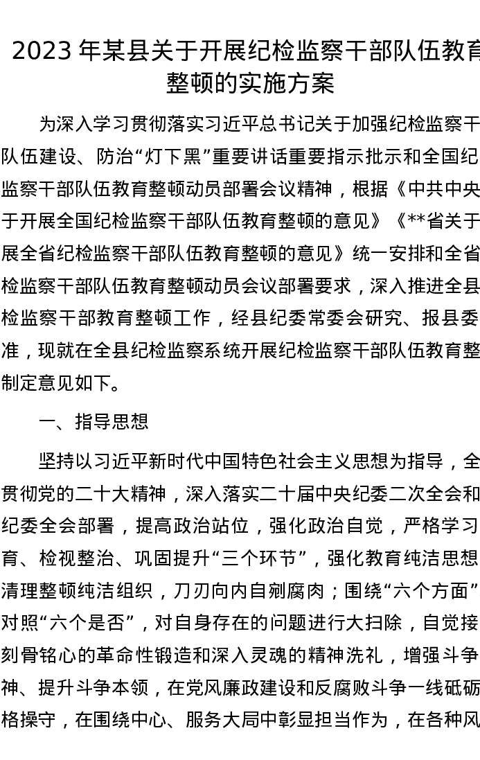 2023年某县关于开展纪检监察干部队伍教育整顿的实施方案