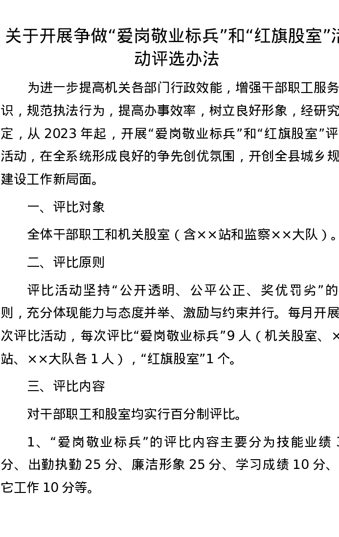 关于开展争做“爱岗敬业标兵”和“红旗股室”活动评选办法