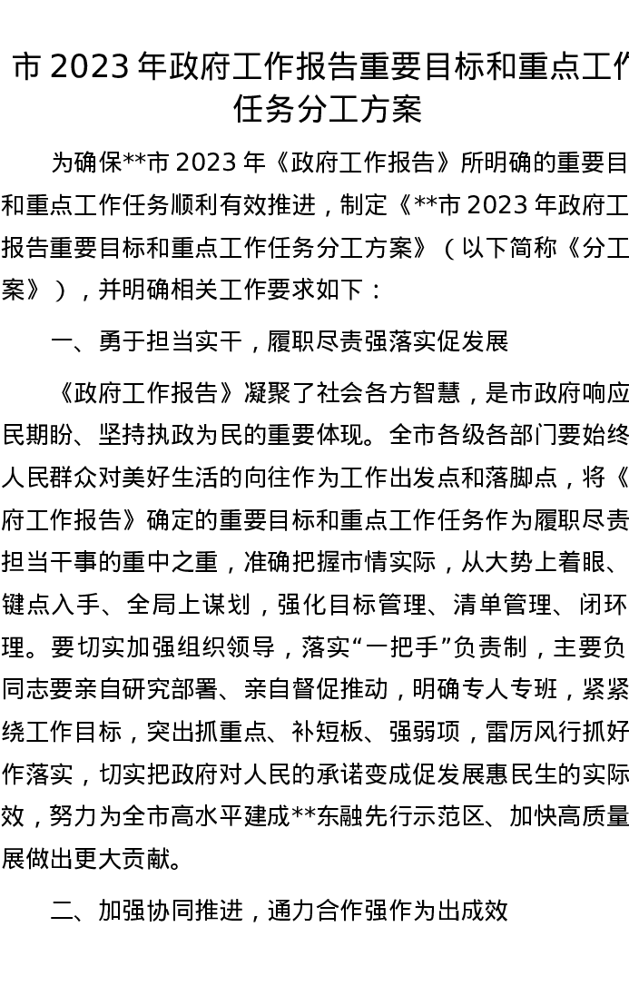 市2023年政府工作报告重要目标和重点工作任务分工方案