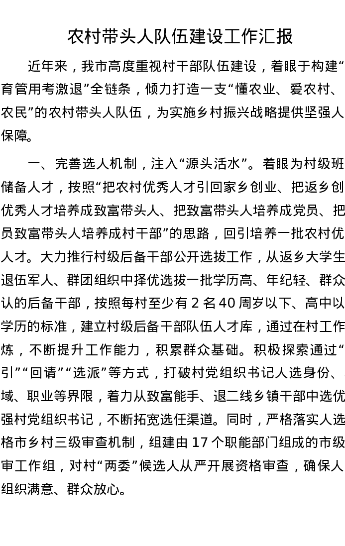 农村带头人队伍建设工作汇报