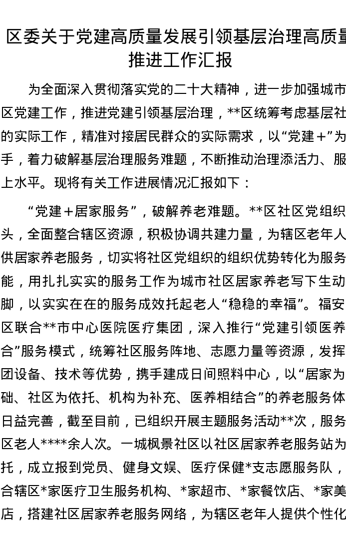区委关于党建高质量发展引领基层治理高质量推进工作汇报