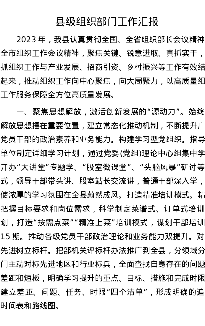 县级组织部门工作汇报