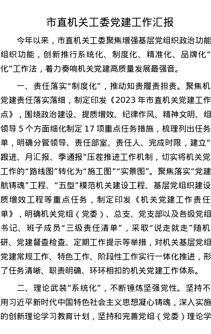 市直机关工委党建工作汇报