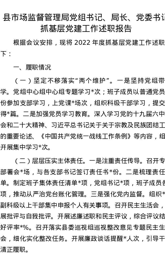 县市场监督管理局党组书记、局长、党委书记抓基层党建工作述职报告