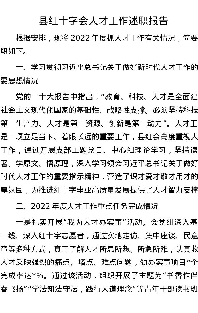 县红十字会人才工作述职报告