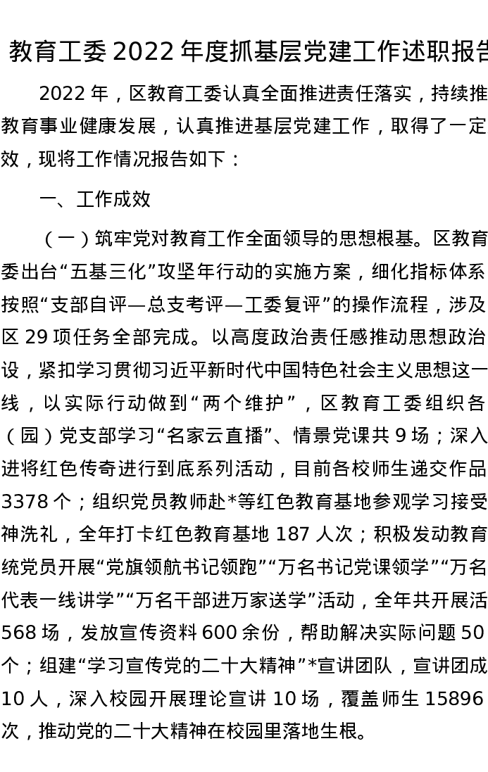 教育工委2022年度抓基层党建工作述职报告