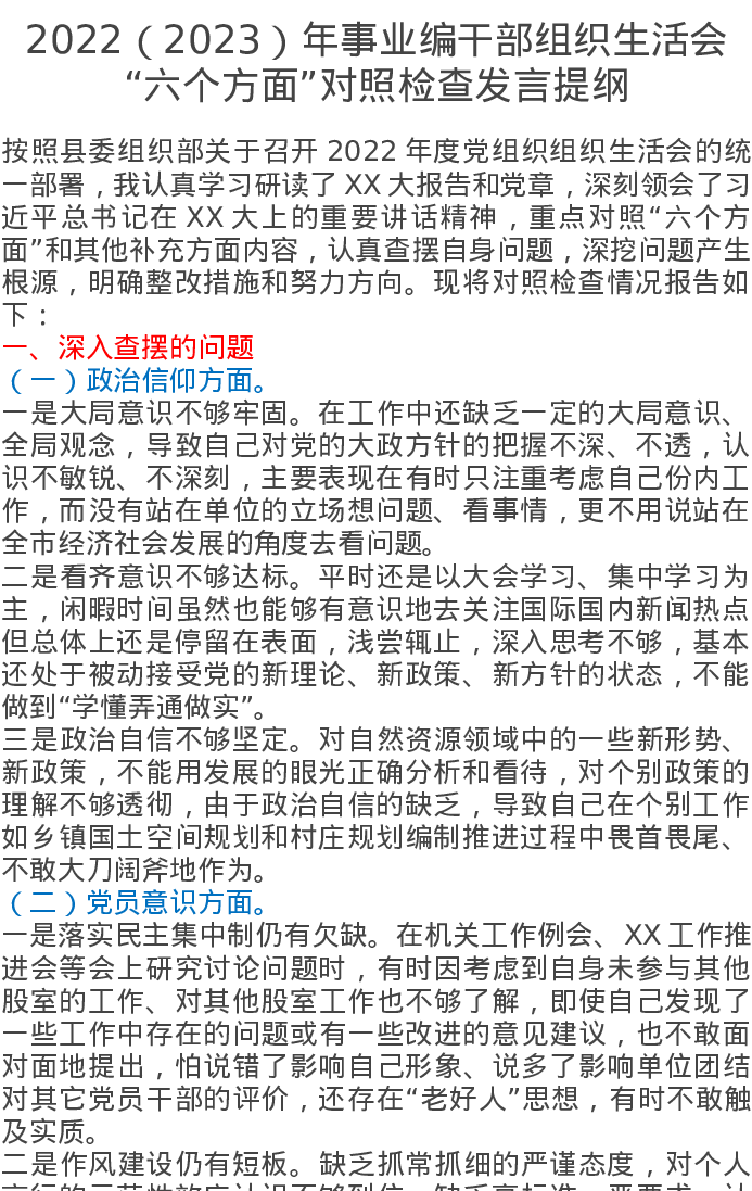 2022(2023)年事业编干部组织生活会“六个方面”对照检查发言提纲