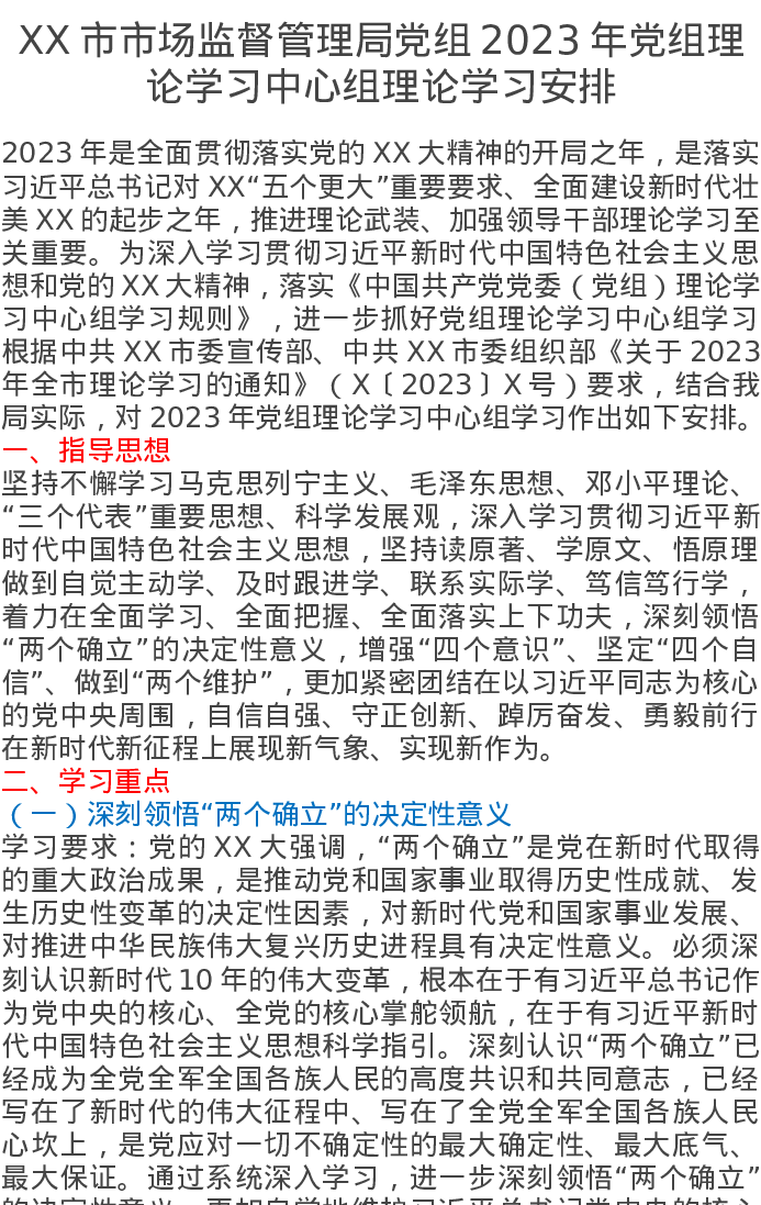 XX市市场监督管理局党组2023年党组理论学习中心组理论学习安排