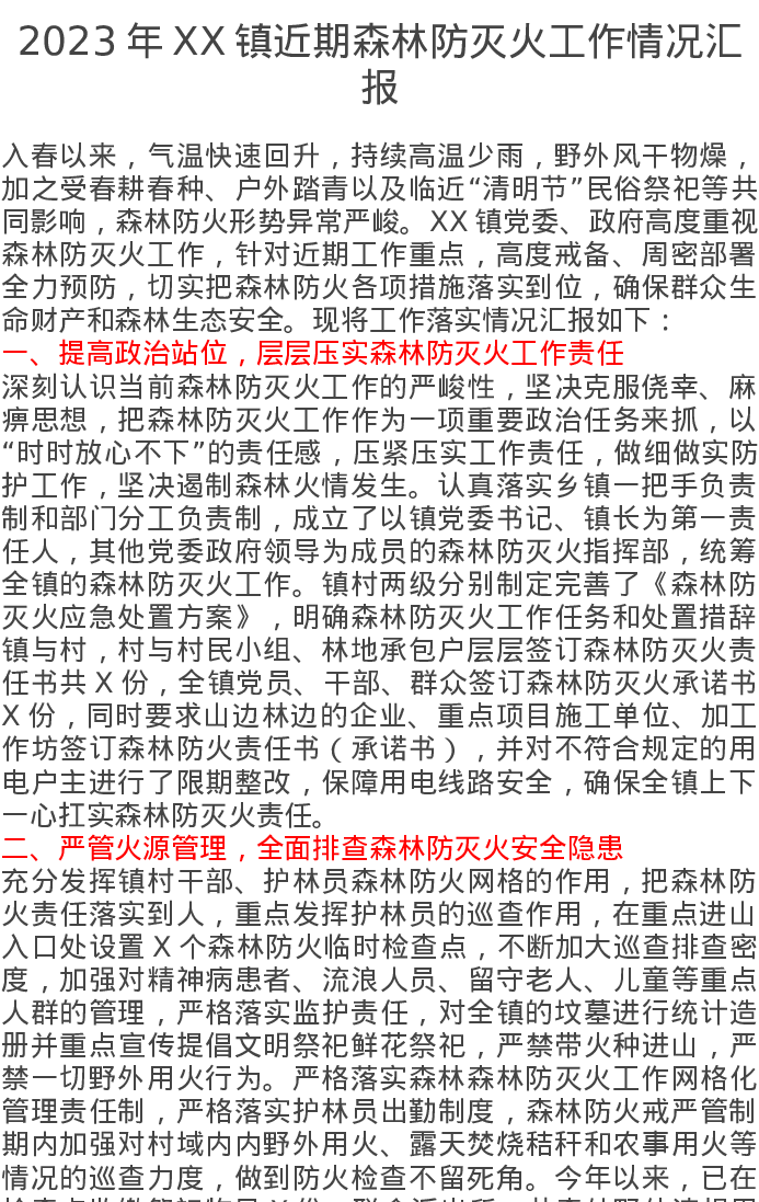 2023年XX镇近期森林防灭火工作情况汇报