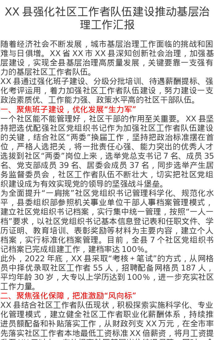 XX县强化社区工作者队伍建设推动基层治理工作汇报