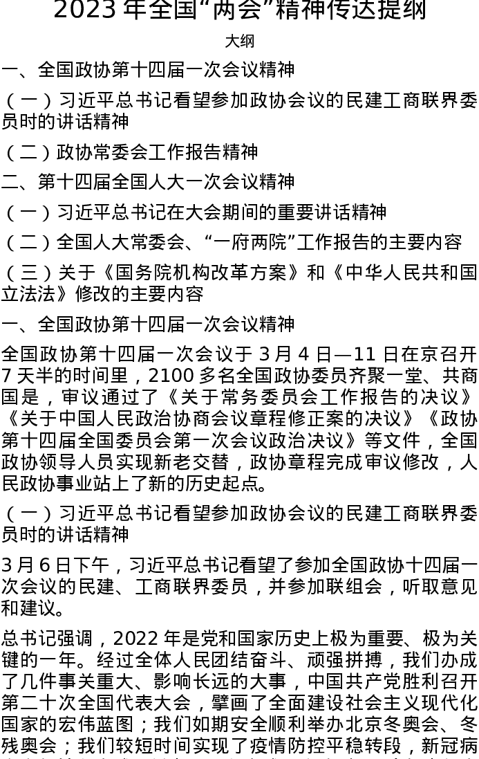 2023年全国“两会”精神传达提纲
