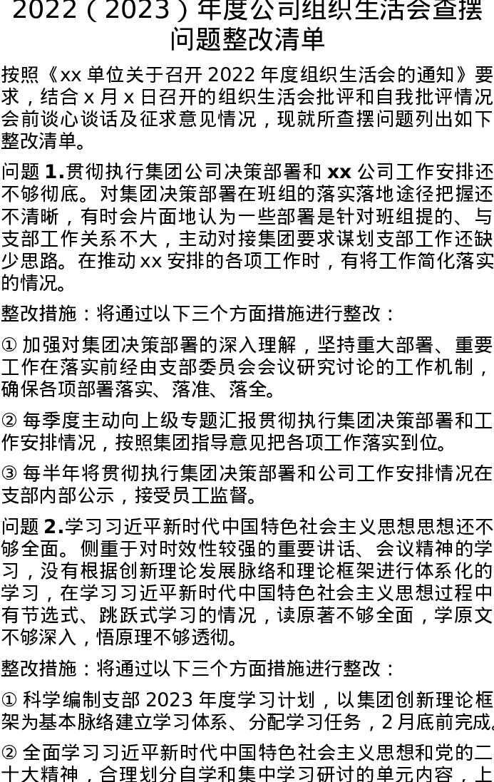 2022(2023)年度公司组织生活会查摆问题整改清单