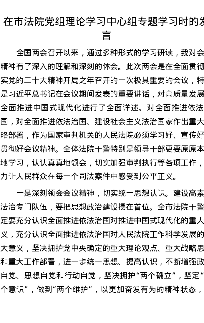 在市法院党组理论学习中心组专题学习时的发言