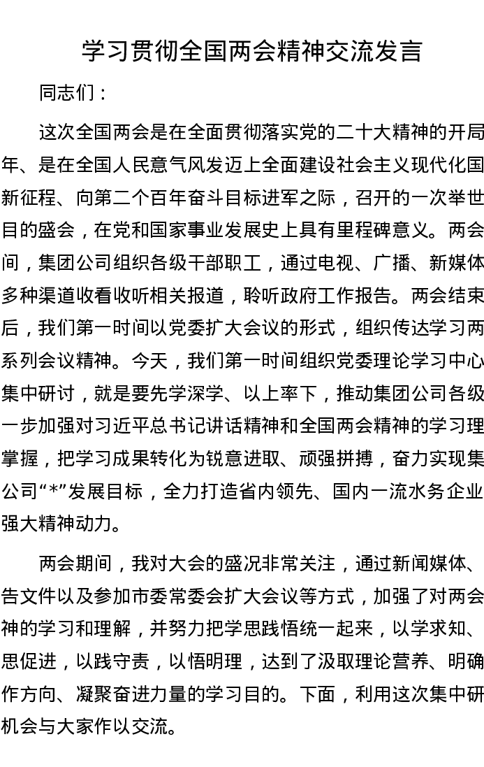学习贯彻全国两会精神交流发言