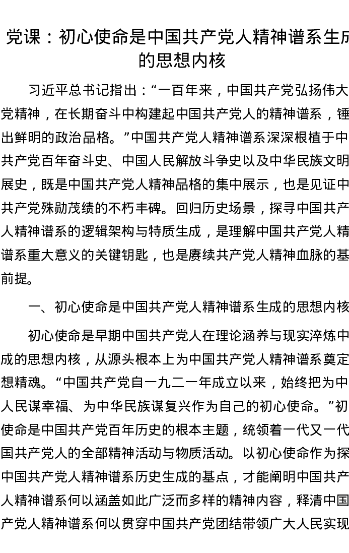 党课:初心使命是中国共产党人精神谱系生成的思想内核