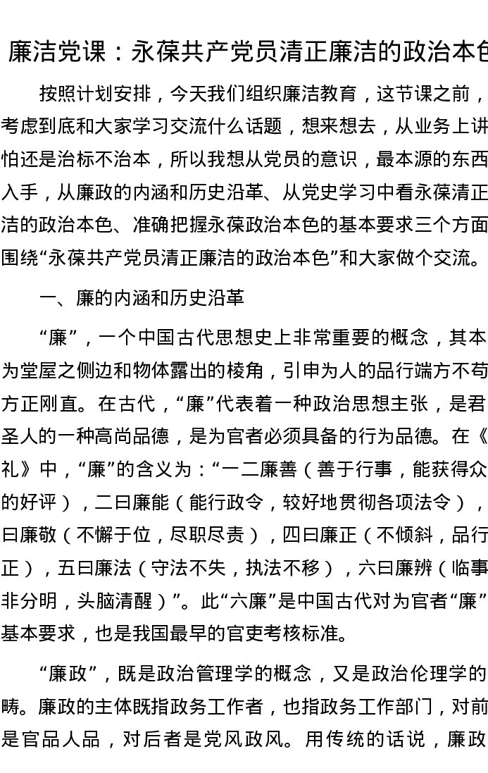 廉洁党课:永葆共产党员清正廉洁的政治本色