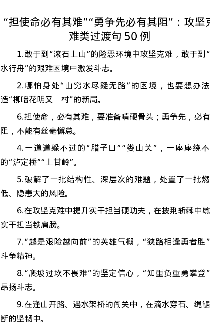 “担使命必有其难”“勇争先必有其阻”:攻坚克难类过渡句50例