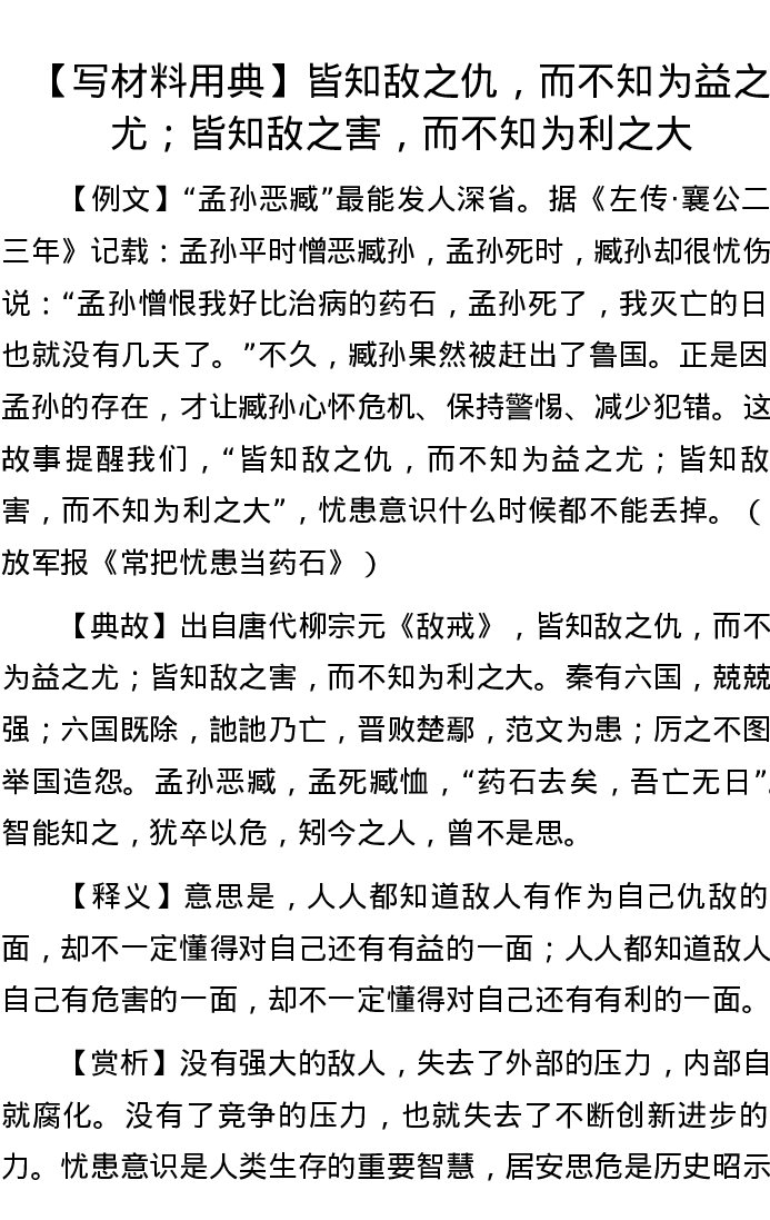【写材料用典】皆知敌之仇,而不知为益之尤;皆知敌之害,而不知为利之大