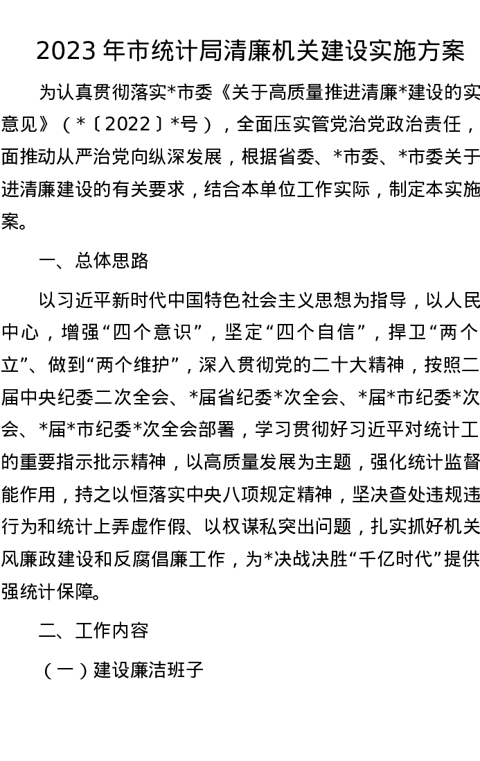 2023年市统计局清廉机关建设实施方案