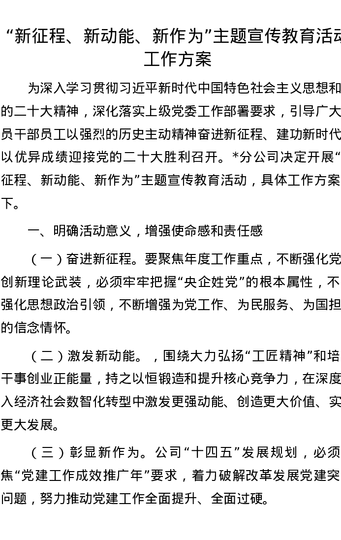 “新征程、新动能、新作为”主题宣传教育活动工作方案