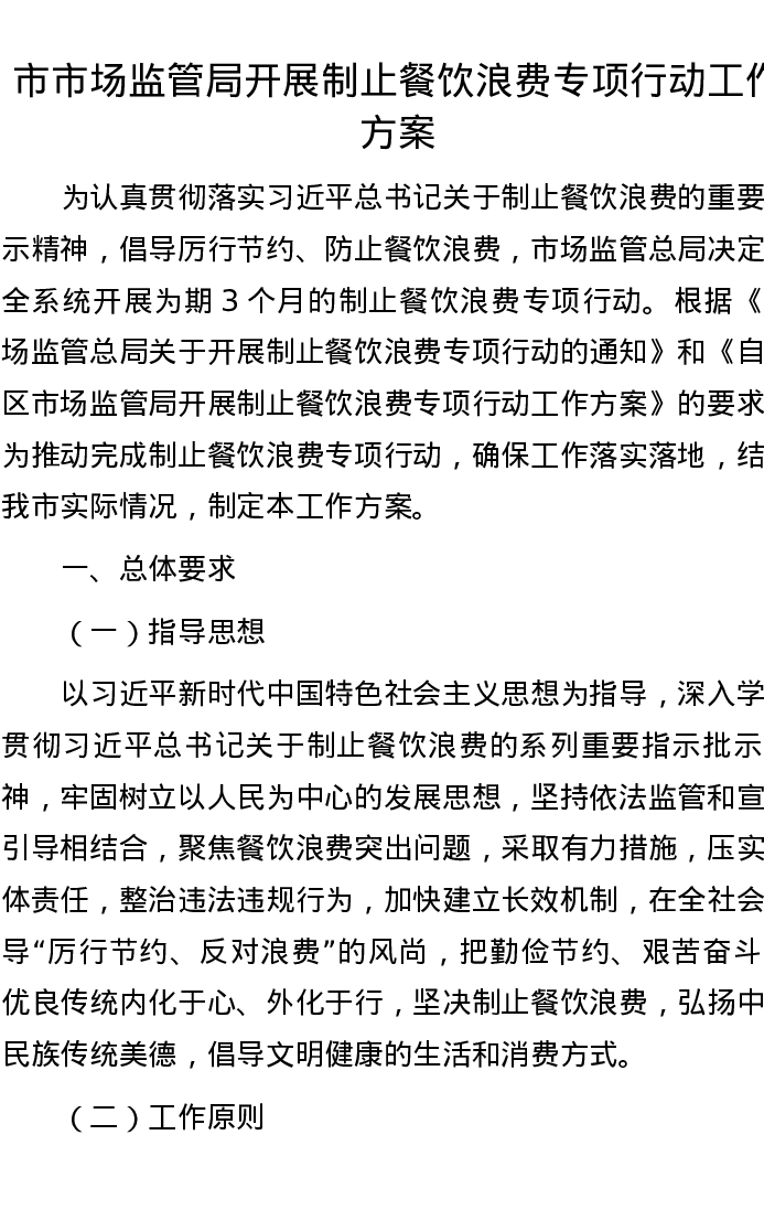 市市场监管局开展制止餐饮浪费专项行动工作方案