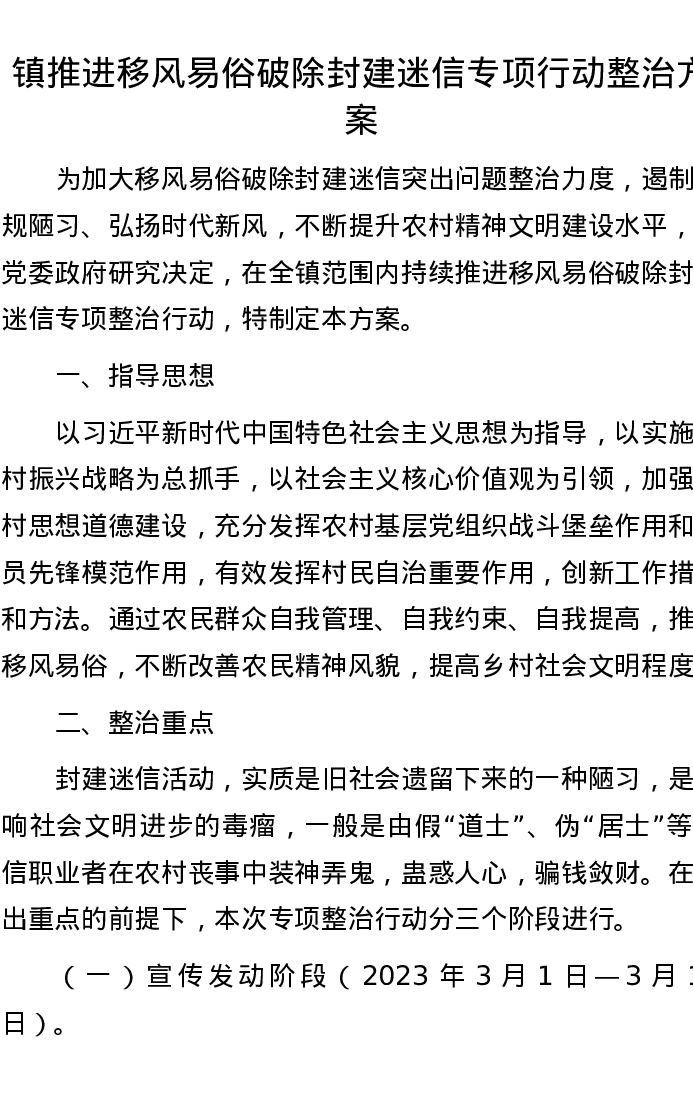 镇推进移风易俗破除封建迷信专项行动整治方案