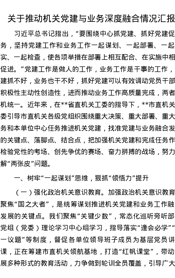 关于推动机关党建与业务深度融合情况汇报