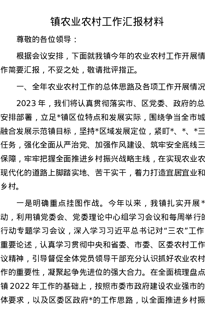 镇农业农村工作汇报材料