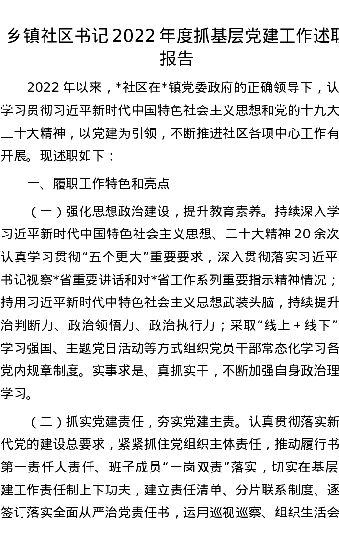 乡镇社区书记2022年度抓基层党建工作述职报告