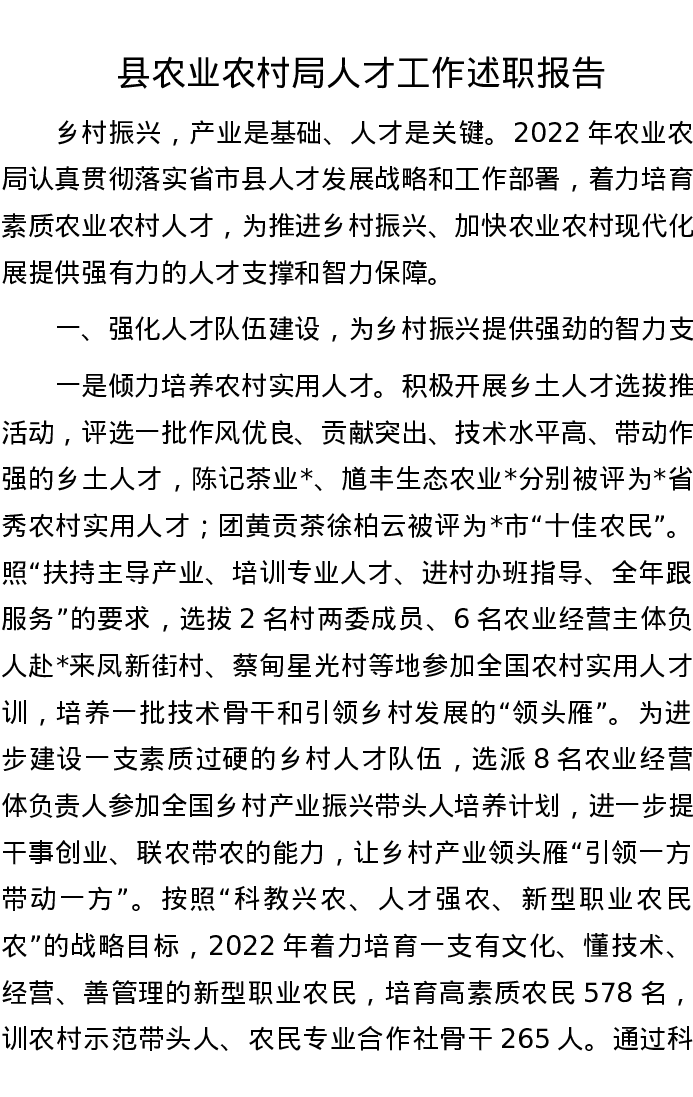 县农业农村局人才工作述职报告