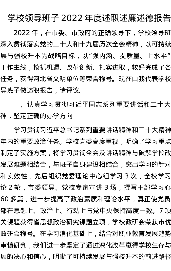 学校领导班子2022年度述职述廉述德报告