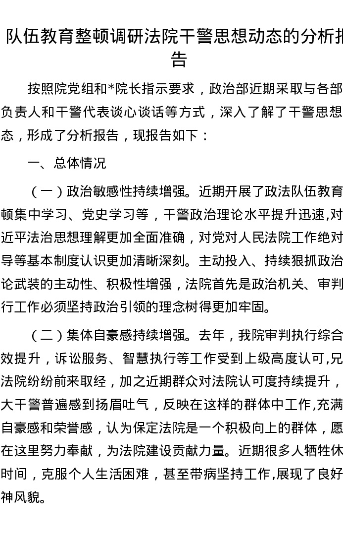 队伍教育整顿调研法院干警思想动态的分析报告