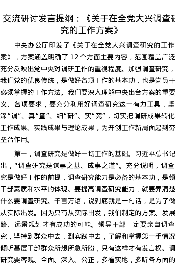 交流研讨发言提纲:《关于在全党大兴调查研究的工作方案》