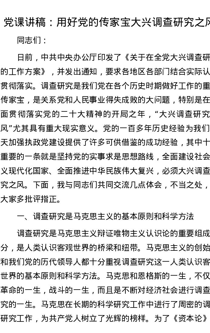 党课讲稿:用好党的传家宝 大兴调查研究之风