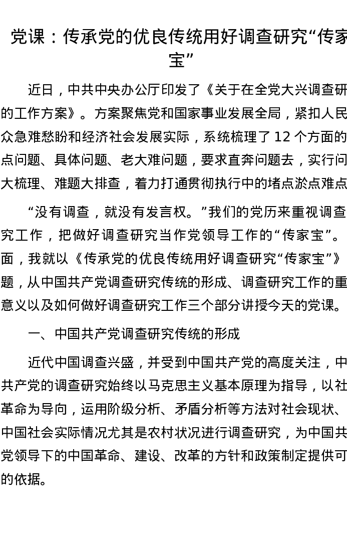 党课:传承党的优良传统 用好调查研究“传家宝”