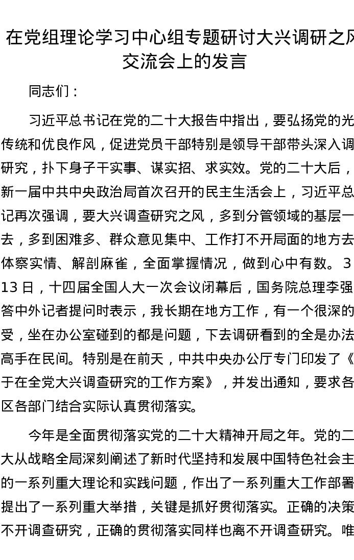 在党组理论学习中心组专题研讨大兴调研之风交流会上的发言