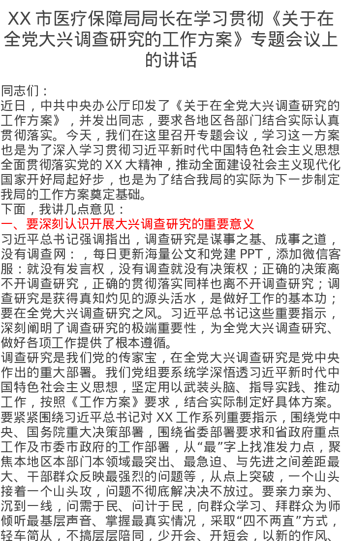 XX市医疗保障局局长在学习贯彻《关于在全党大兴调查研究的工作方案》专题会议上的讲话