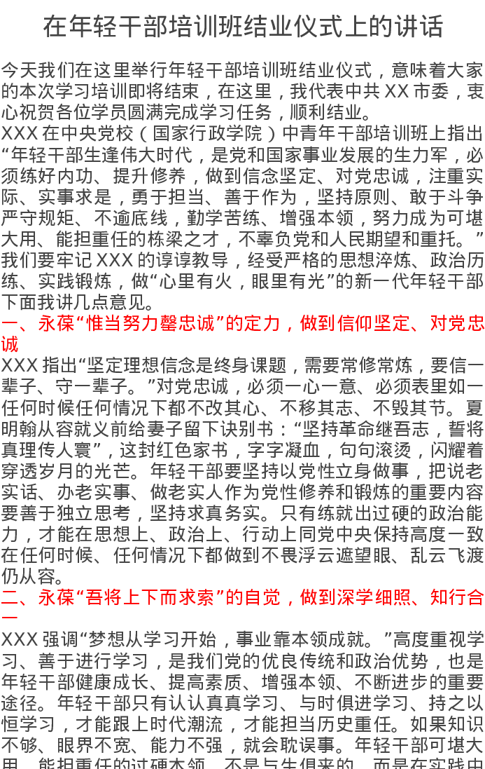 在年轻干部培训班结业仪式上的讲话