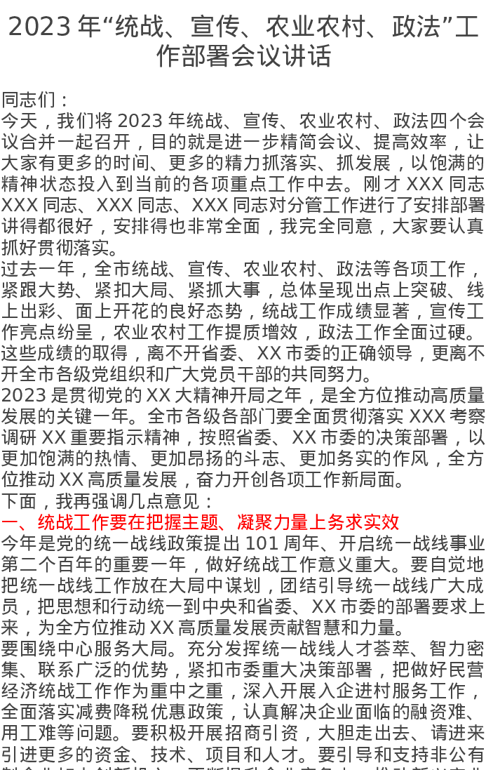 2023年“统战、宣传、农业农村、政法”工作部署会议讲话