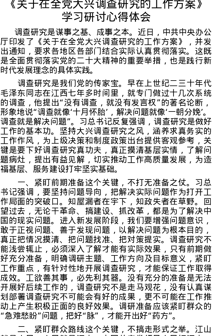 《关于在全党大兴调查研究的工作方案》学习研讨心得体会
