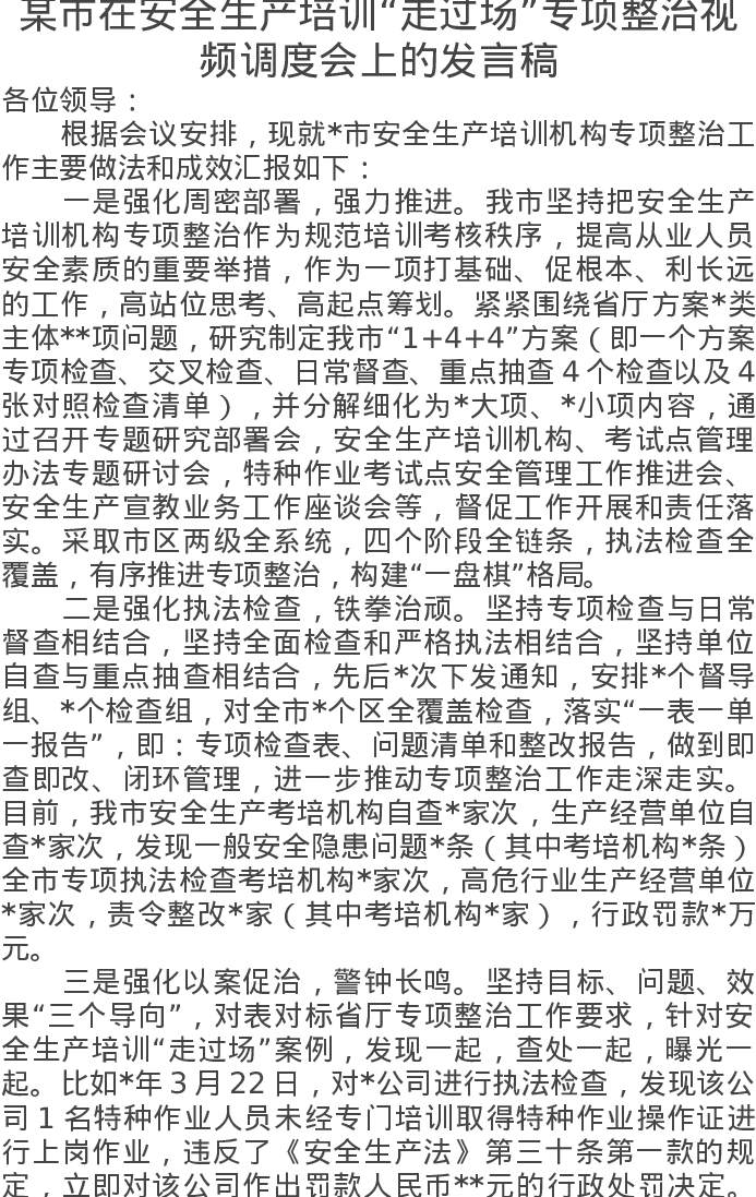 某市在安全生产培训“走过场”专项整治视频调度会上的发言稿