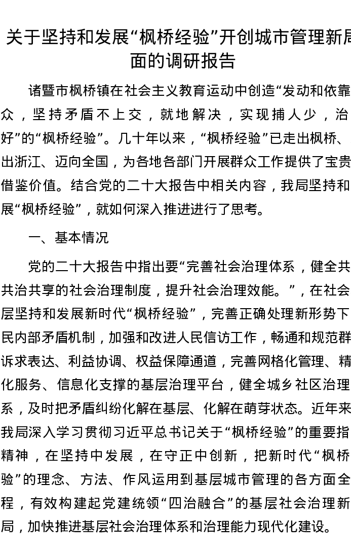关于坚持和发展“枫桥经验”开创城市管理新局面的调研报告