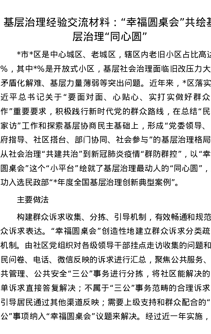 基层治理经验交流材料:“幸福圆桌会”共绘基层治理“同心圆”