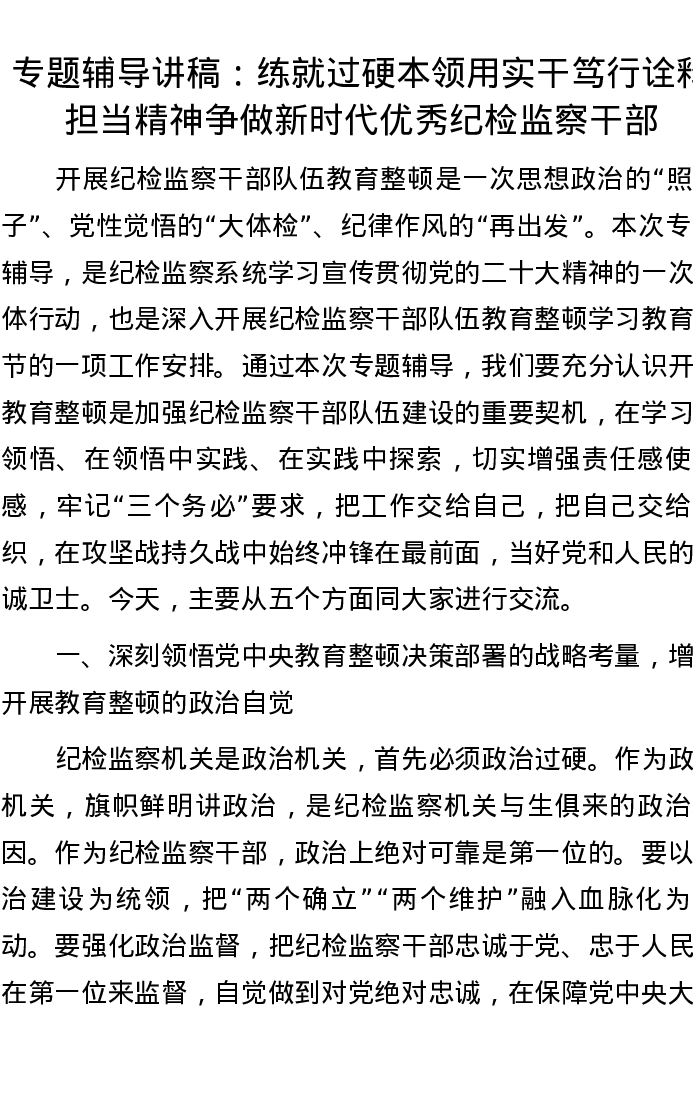 专题辅导讲稿:练就过硬本领用实干笃行诠释担当精神 争做新时代优秀纪检监察干部